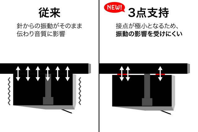 この振動伝播を抑制させるためには、カートリッジとヘッドシェルの接点を極小とする“3点支持”が望ましい方法です。